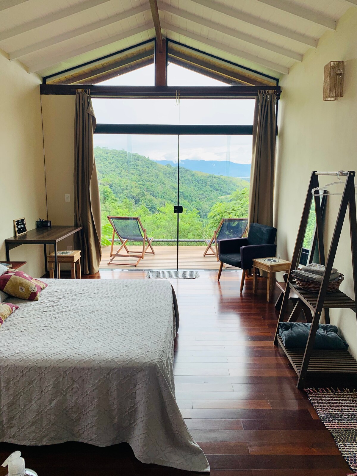 Bungalow con mucha personalidad y todas las comodidades para disfrutar de sus días en Paraty. Perfecto para aquellos que vienen en busca de paz y mucha belleza natural, encontrarán aquí un espacio muy especial. Cuenta con una cama doble Queen, mueble para maletas, escritorio, aire acondicionado, ventilador de techo, baño con ducha de gas y una cocina, con infraestructura para cocinar: cocina de gas de 2 hornillas, minibar, horno eléctrico, cafetera y utensilios de cocina, ollas... Tiene balcón y terraza privados.