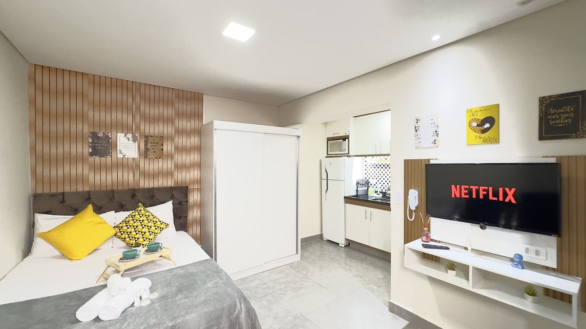 Disfruta de una estancia en un estudio moderno y acogedor, totalmente amueblado y equipado con un ajuar completo y utensilios de cocina. *ESTACIONAMIENTO*: NO TENEMOS ESPACIOS. Hay estacionamientos las 24 horas cerca. * HORARIO FLEXIBLE *: Podemos hacer horarios más flexibles, sujeto a disponibilidad. *UBICACIÓN*: frente al centro comercial Anália Franco. Mercados, farmacias, hospitales alrededor y fácil acceso a las principales avenidas y eventos de la ciudad.