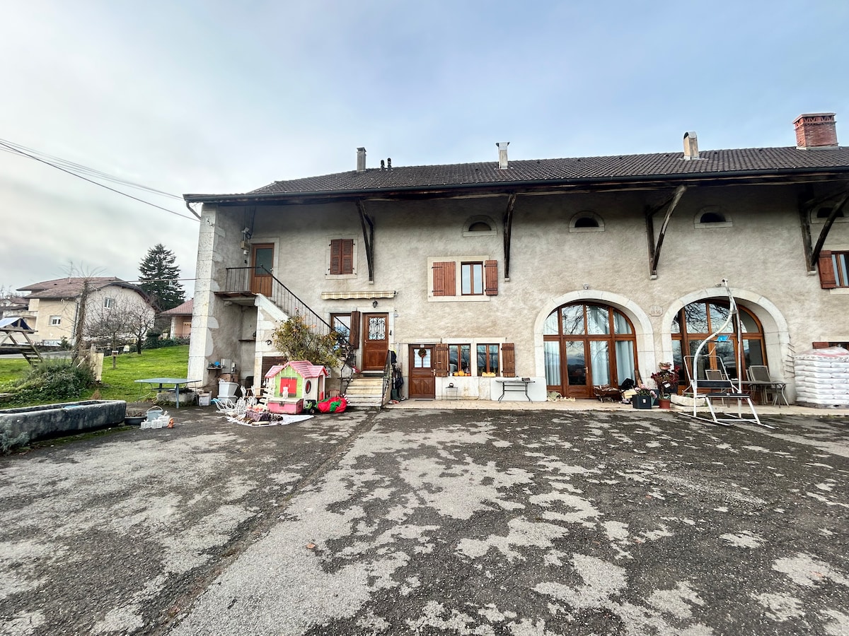 Venez profiter d’un appartement de charme de 55 m², entièrement rénové dans une ancienne ferme familiale de 1830. Le lieu a conservé son authenticité, avec une belle cour pavée et une atmosphère paisible. Le logement, entièrement privatisé, offre une ambiance bohème et une jolie vue partielle sur le Jura depuis le salon et la chambre. Situé à la frontière de Genève, vous êtes idéalement placés : •10 min de l’aéroport •15 min du centre-ville •5 min du CERN •Commerces à proximité •Bus à 2 min