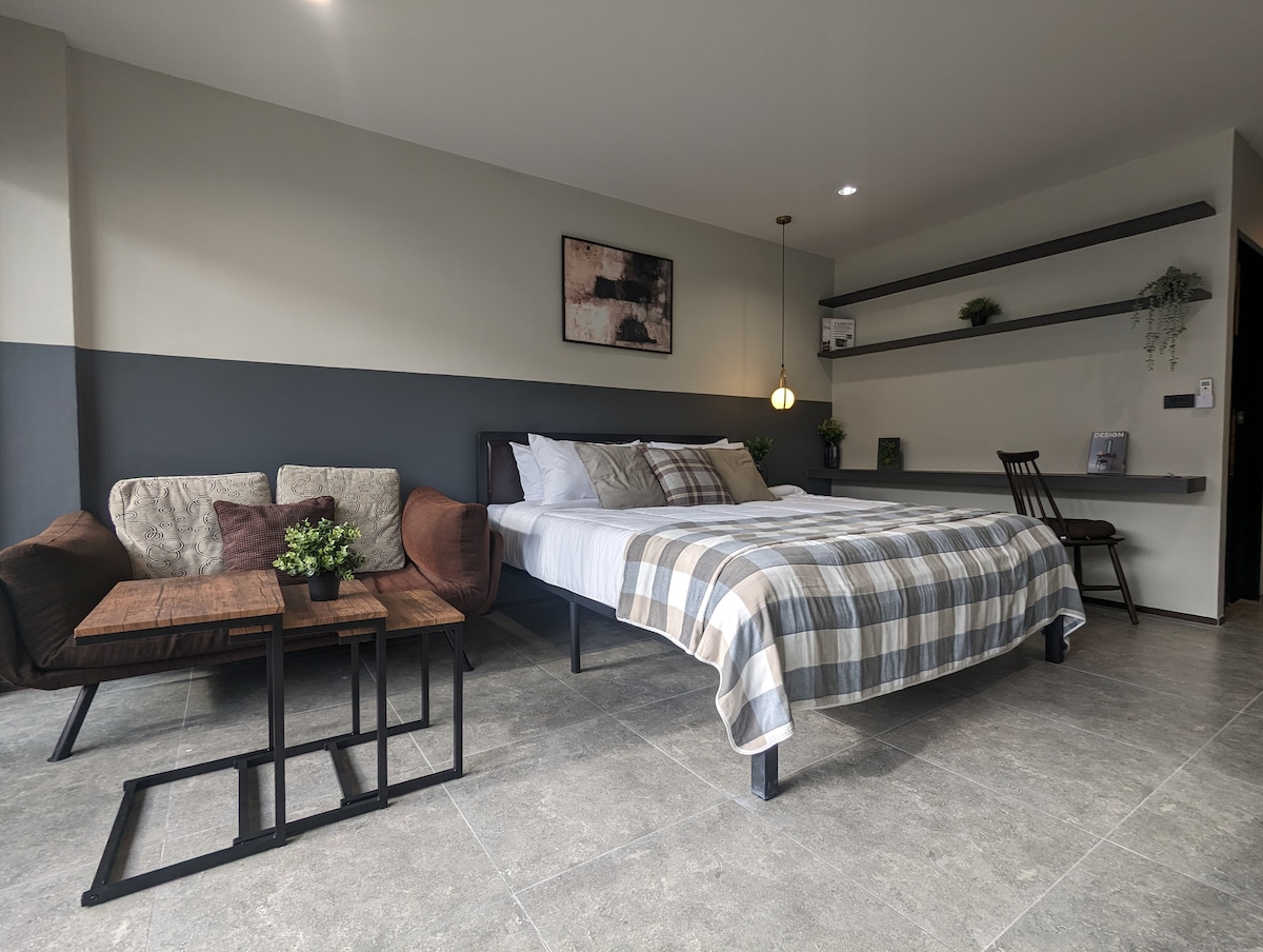 El refugio de habitación doble Anchan con balcón en el Anchan Boutique Hotel ofrece 42 metros cuadrados de confort moderno. Cuenta con una cama doble, balcón privado, aire acondicionado y conexión WiFi gratuita. La cocina pequeña incluye una nevera, hornillas y microondas, perfecta para estadías largas. Las comodidades incluyen TV LCD, caja fuerte en la habitación, escritorio y baño privado con ducha y artículos de aseo gratuitos. Ideal para viajeros solitarios o parejas, se encuentra cerca de gimnasios Muay Thai, cafés y Chalong Bay para un retiro tranquilo.