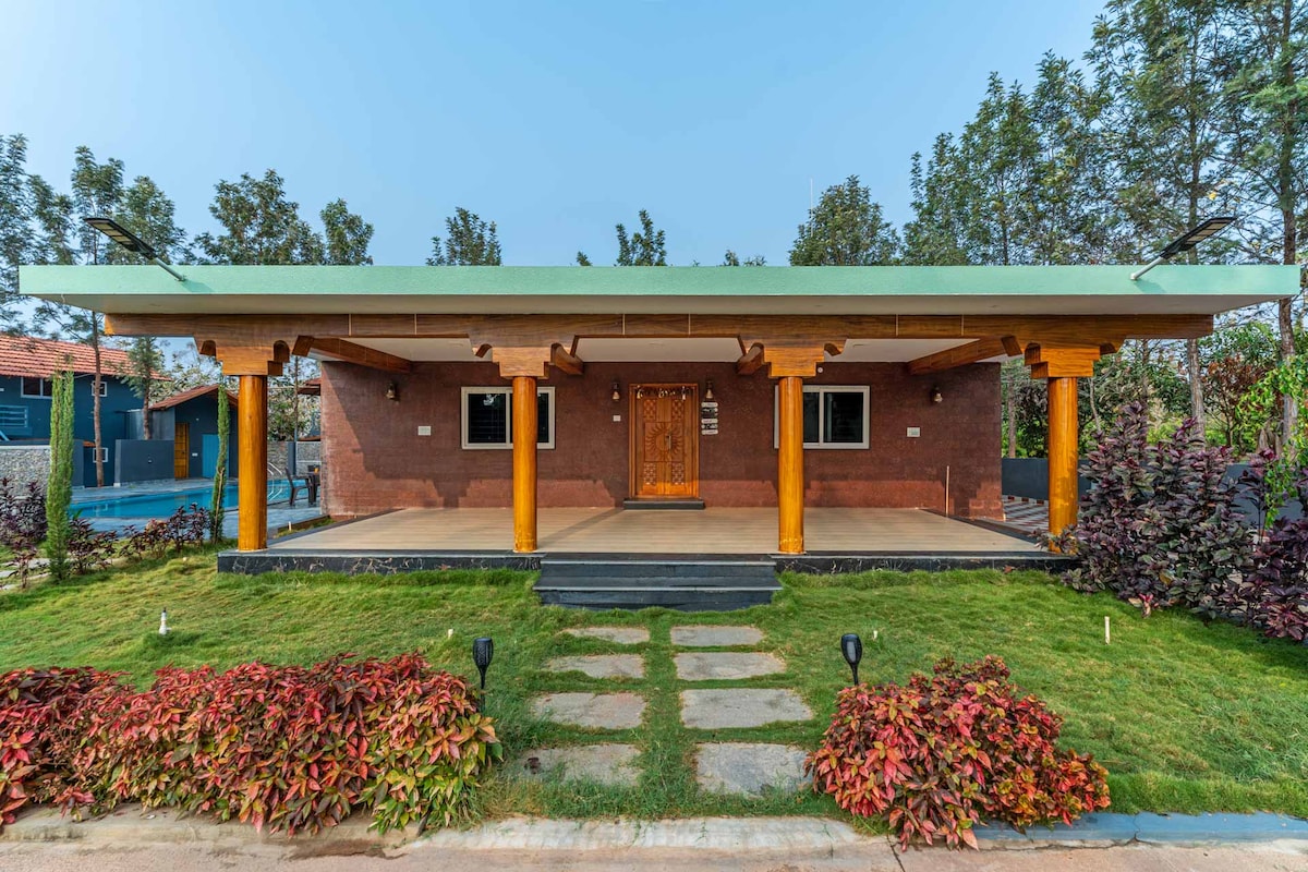¡Escápate a la naturaleza sin renunciar a la comodidad! Esta acogedora casa de 3BHK, ubicada debajo de las pintorescas colinas de Chamundi, ofrece vistas al bosque, una piscina privada, espacio de oficina, un sauna de diseño personalizado y 3 baños adjuntos. El palacio de Mysore y el famoso zoológico de Mysuru están a solo 4 km. Comienza tus mañanas con una deliciosa dosis de Mysore masala en restaurantes auténticos cercanos. Perfecto para familias, trabajadores remotos o cualquier persona que busque una escapada tranquila con comodidades modernas en el corazón del encanto de Mysuru.