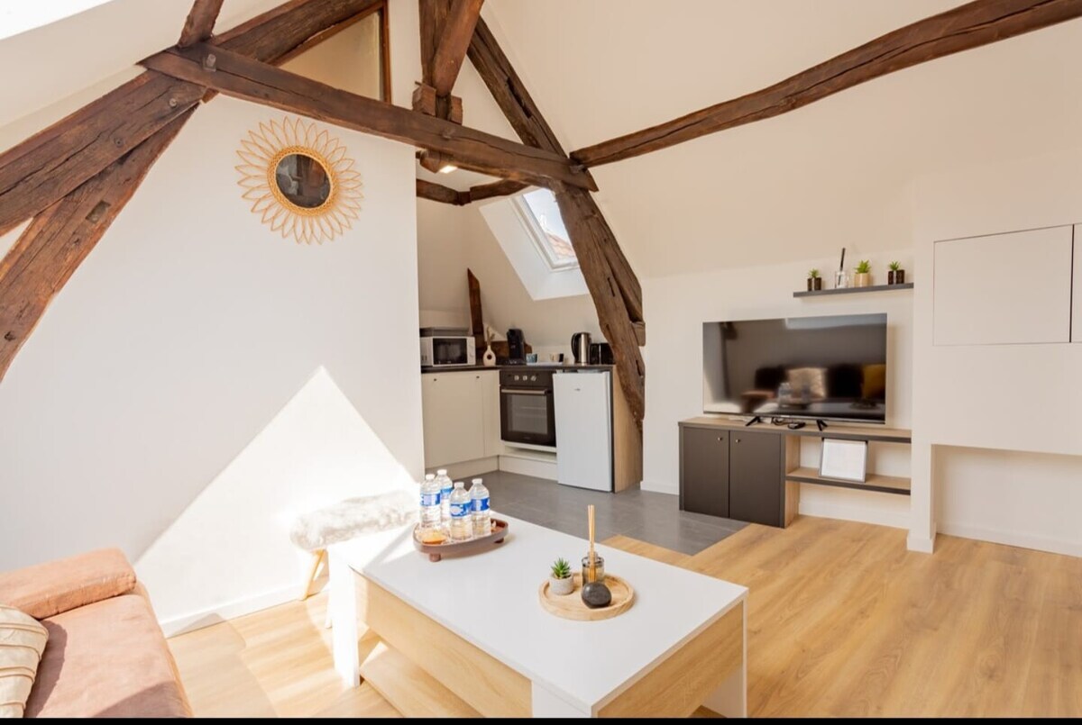 "Une nuit sous les étoiles », un moment suspendu où le temps semble s’arrêter. Ce charmant appartement niché sous les toits et baigné de lumière douce vous accueille avec son salon au canapé vintage et ses coussins, propice à la détente. Le soir il suffit de lever les yeux pour admirer le ciel étoilé. La chambre mansardée, intime et lumineuse, prolonge cette ambiance romantique. Le bois et la lumière tamisée rappellent la douceur d’un refuge où chaque instant est empreint de charme et de magie.