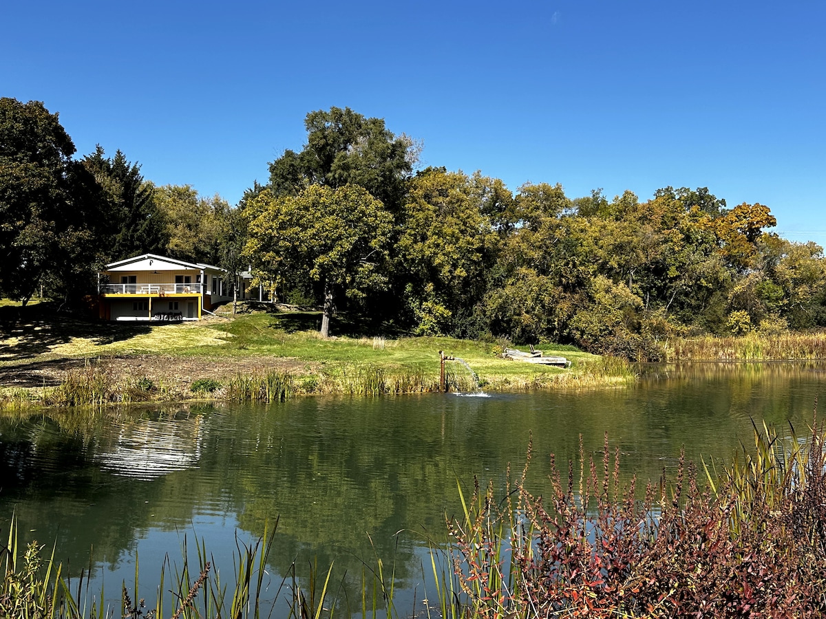 The Pond House, a vintage glass cabin filled with art, water views & eclectic vibes privately perched on the sacred grounds of Hackmatack Retreat Center. Native prairie, a winding slow river, two ponds, 200+ year old oaks & big sky- Countless places to curl up, gathering, focus-- nooks and crannies indoors and out, we offer “time out for time in” amidst this noisy world. Minutes from 2 small towns, all amenities, we're all about peace & ease-- let us custom curate your experience !