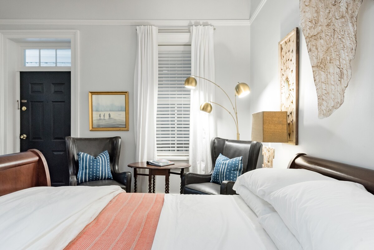 Turn back time in this refined historic Charleston residence (OP2025-06356). Soaring 12-ft ceilings, polished wood floors, and grand sash windows set the tone for an elegant retreat. A master bedroom and curtained sunroom each offer king beds for flexible sleeping. Located in a quiet, walkable historic downtown neighborhood. Perfect for couples or a sophisticated girls’ weekend. Private entrance, thoughtfully designed 1,000 sq. ft. interior. Exclusive off-street parking with EV charger.