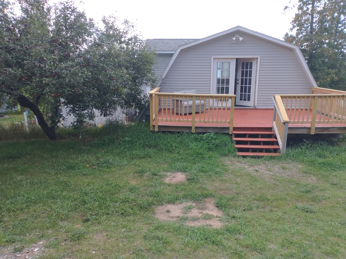 Buena área de estar para pasar el rato, abierta con cocina completa, con 2 dormitorios 1 con cama queen y otro con una litera. Terraza de 12 x 16 en la parte posterior. Está cerca de varios lugares de bodas (granja castillo), playas, aros y está en la ciudad, cerca de restaurantes, golf y parques, golf de disco y pickleball. Está a 15 minutos de Boyne Mountain Skiing, con parque acuático, ciclismo de montaña y Sky Bridge.