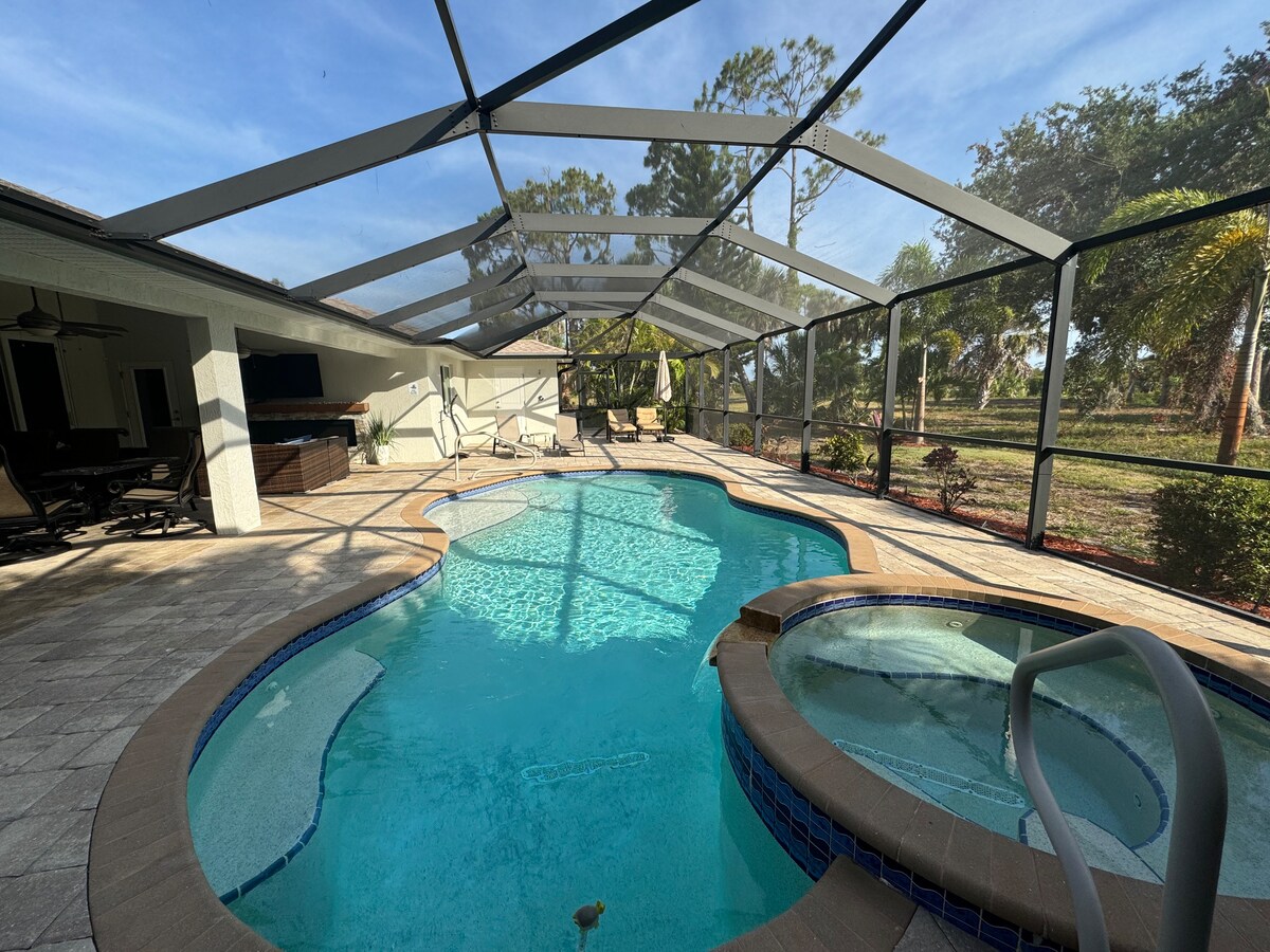 La sala de estar tiene un televisor inteligente de 65 pulgadas, montado en la pared con una chimenea LCD debajo con sonido envolvente. Todos los televisores tienen Netflix. La sala de bar tiene una nevera pequeña, mesa de billar y tablero de dardos. El exterior tiene un lanai privado con piscina climatizada y un fogón de propano. Disfruta del sonido de sonos con un televisor inteligente de 55 pulgadas en el dormitorio principal. El segundo dormitorio también tiene un televisor. La sala de bar también tiene sonido, así como el lanai. A 30 minutos de varias playas. El garaje no estará disponible. Casa ubicada en un tranquilo Cul de Sac.