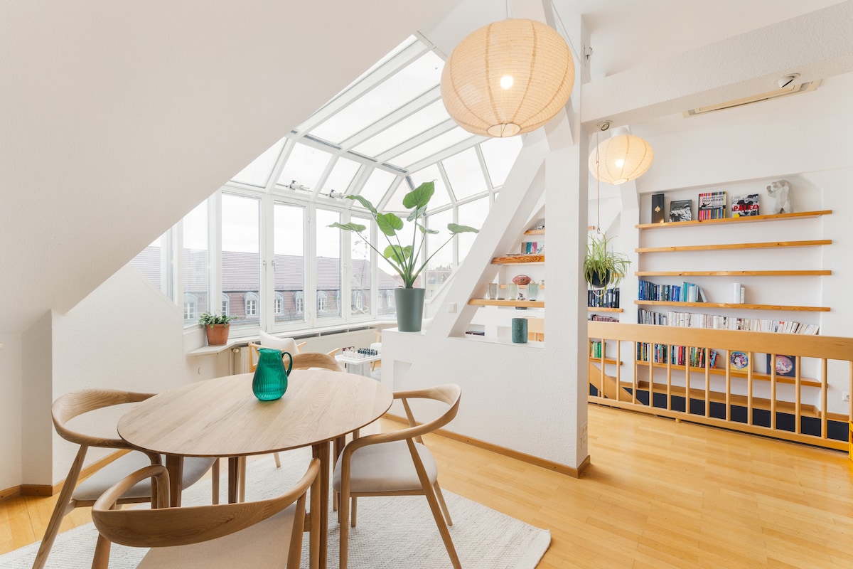 Auf zwei geräumigen Etagen erwartet dich eine einzigartige Mischung aus modernem Design und charmantem 90er-Stil. Dank der ruhigen Lage kannst du hier wunderbar abschalten, während du gleichzeitig mitten im pulsierenden Herzen Berlins bist. Die stilvolle Einrichtung zieht sich durch alle Räume und verleiht dem Penthouse seinen ganz eigenen Charakter. Genieße die offene, großzügige Wohnfläche, die viel Platz zum Entspannen bietet, und entdecke liebevolle Details, die den 90ern Tribut zollen.