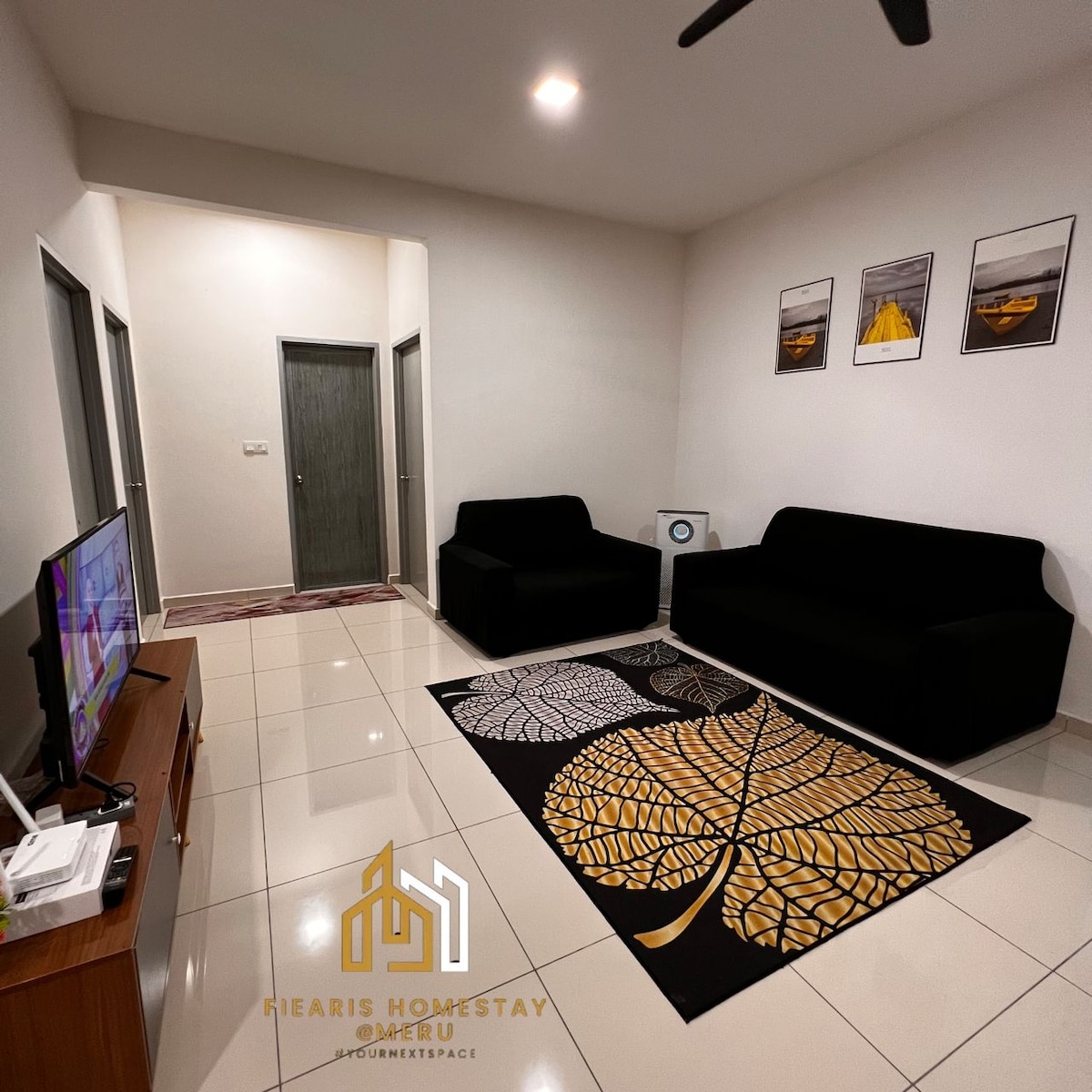 La unidad puede alojar de 4 a 7 huéspedes . Wifi gratuito de alta velocidad . TV-Netflix, Disney Plus, MyTV. . 1 cama tamaño queen, 2 camas individuales, 3 futones y 1 sofá. . Sala de estar y dormitorio principal (con aire acondicionado) . Dormitorios 2y3 (ventilador de techo) . Calentador de agua: ducha caliente. . Cocina,refrigerador,microondas, hervidor eléctrico y arrocera . Se proporcionan 2 toallas (para más, por favor,por favor, se añaden rm5/PC) . Cerca de muchas atracciones, restaurantes y cascadas. . A solo 5 minutos en coche de Mydin Meru y la terminal de autobuses Aman Jaya, Ipoh.