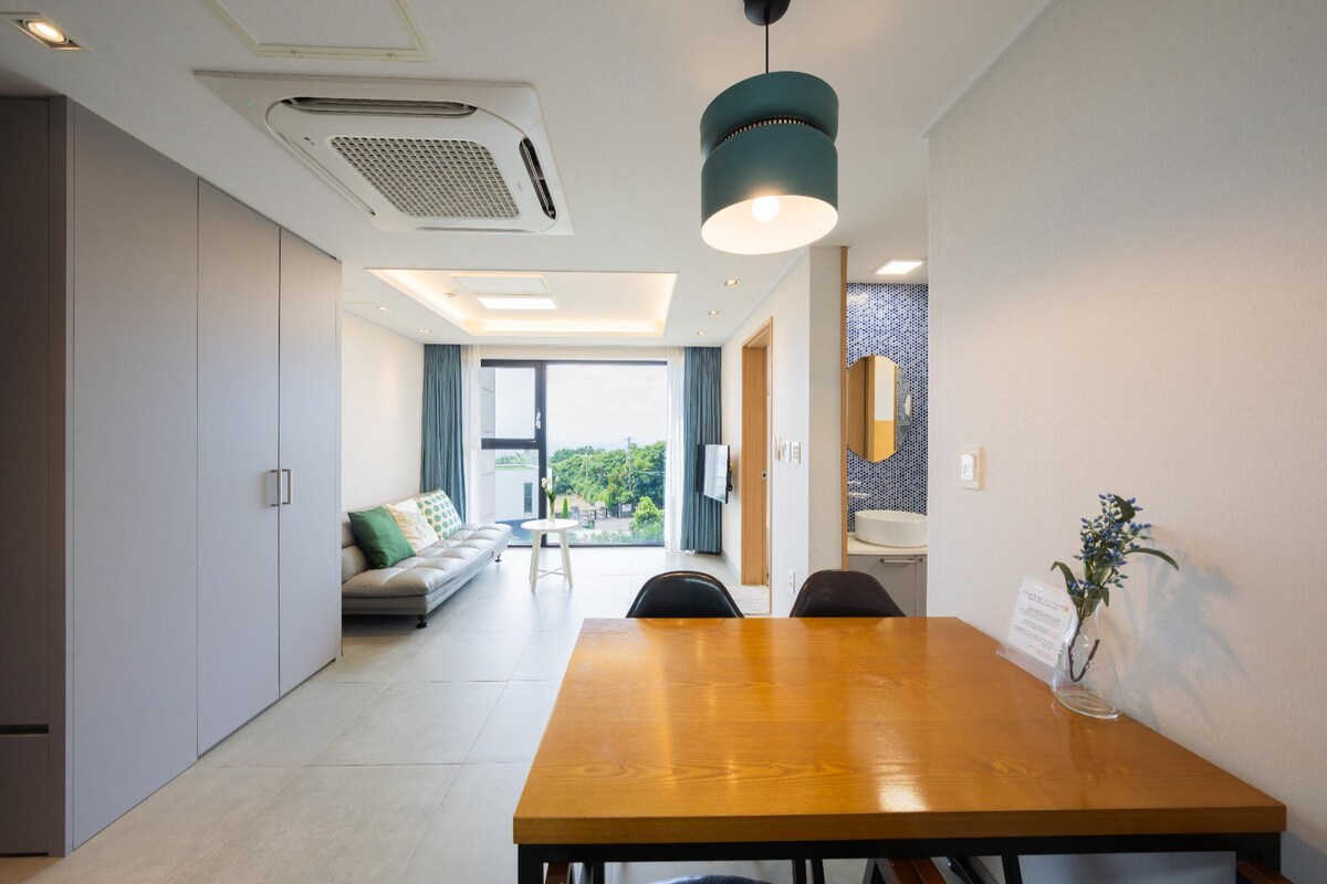 Hola. Ubicado sobre un acantilado en el centro de Seogwipo, este espacio ofrece vistas al océano y a las islas. Con 66㎡ garantiza privacidad y tiempo propio. Aunque es tipo estudio, el dormitorio, sala y cocina están claramente separados, brindando amplitud y comodidad. En la terraza podrá disfrutar del spa y de una barbacoa con vista al mar. Desayune frente al mar en la piscina infinita a diario. La piscina abre de mayo a octubre. El lounge ofrece desayuno gratuito con vistas a Beomseom.:)
