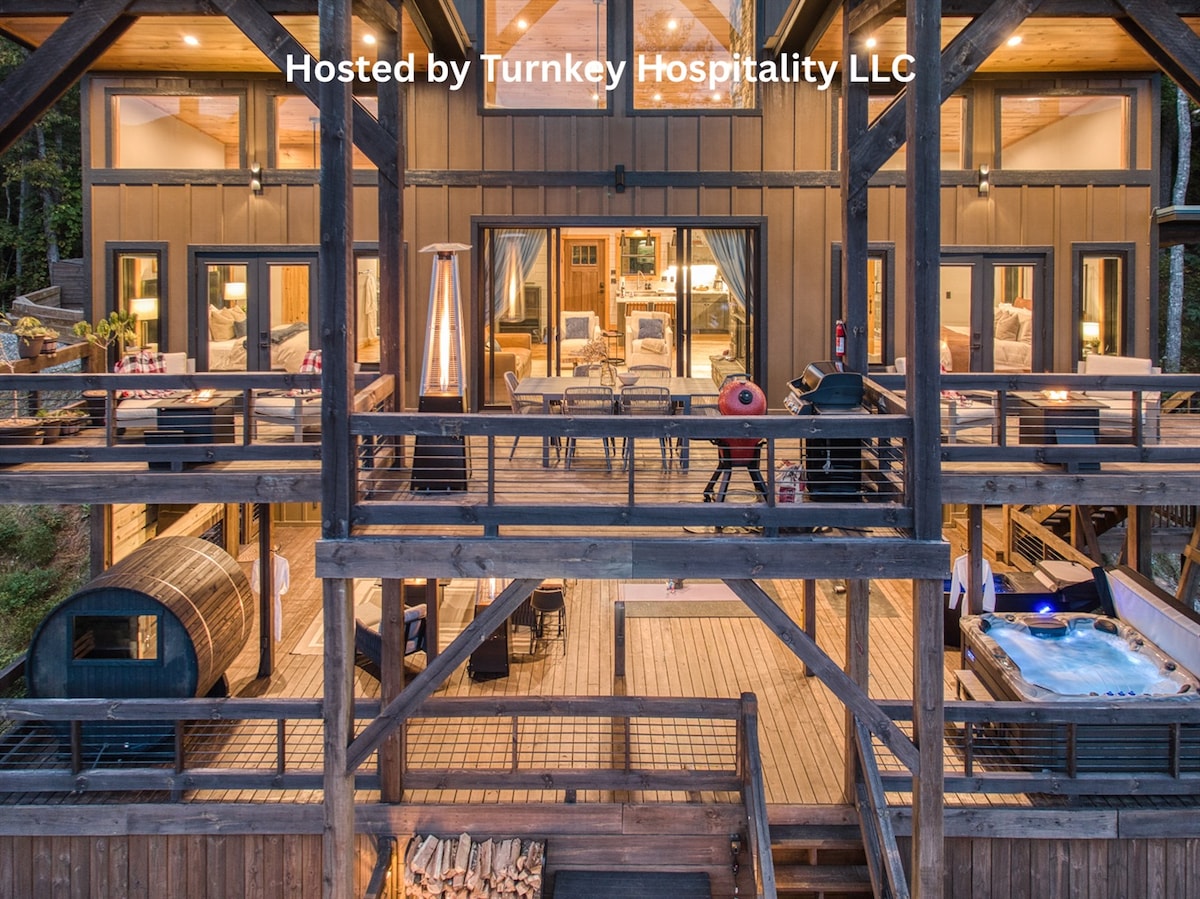 ✔ Jacuzzi: spa para 7 personas. ✔ A pocos minutos del centro de Blue Ridge Camas tamaño ✔ KING en ambas habitaciones Chimeneas de leña ✔ interiores y de gas al aire libre ✔ ¡Cesta de aperitivos de bienvenida! ¡Cargador universal para vehículos eléctricos✔ Tesla! Televisores ✔ inteligentes en todas partes Lujosa cabaña junto al árbol de @ minwicabins con estilo contemporáneo y encanto rústico. Disfruta de vistas a la montaña de largo alcance, lujosas habitaciones con baños tipo spa y acogedoras chimeneas. Perfecto para parejas y familias pequeñas que buscan un refugio de montaña sereno a pocos minutos del centro.