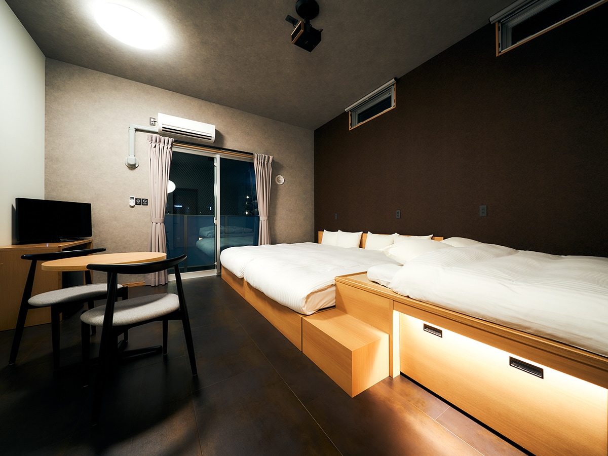 Reizenmachi ha sido el puerto de Hakata durante 800 años. El Hotel Nuage se encuentra en un rincón tranquilo donde permanecen antiguos santuarios, templos y callejones estrechos. Una suite de un piso con paredes de vidrio a poca distancia de las estaciones de Nakasu-Kawabata, Gofukumachi, Gion y Kushida Shrine-mae. A través de las grandes ventanas, las luces de la ciudad y la luz cambiante de la mañana y la noche se filtran lentamente en la habitación. Un paso por debajo de la entrada, la sala de estar y el dormitorio forman un piso hundido.
