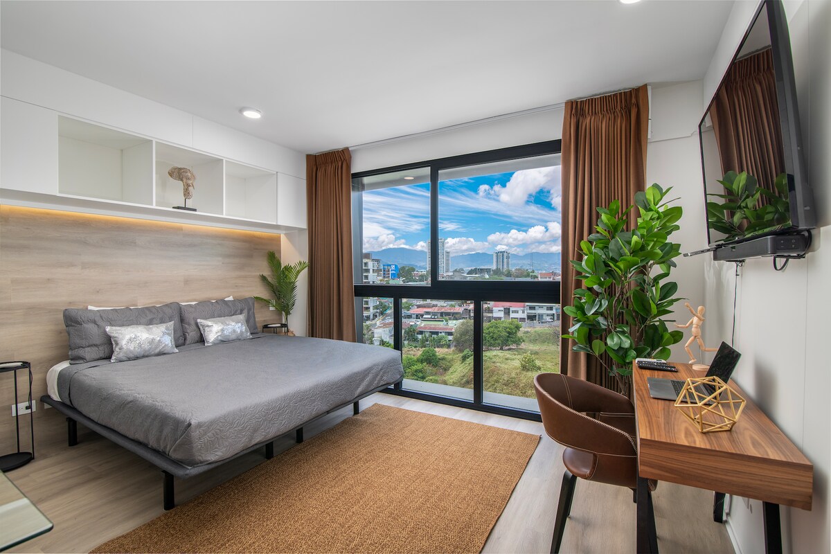 San José desde un moderno apartamento con vistas panorámicas en el exclusivo complejo en la Sabana. Totalmente equipado con Wi-Fi 5G, Smart TV, cocina completa y parqueo privado. Amenidades premium como piscina, gimnasio, sauna, carriles de nado, cancha multiusos, sala de karaoke y hermosas áreas verdes. A solo pasos del Parque La Sabana, el Estadio Nacional y Restaurantes. Ideal para viajeros de negocios, parejas o cualquier persona que busque estilo en la vibrante capital de Costa Rica.