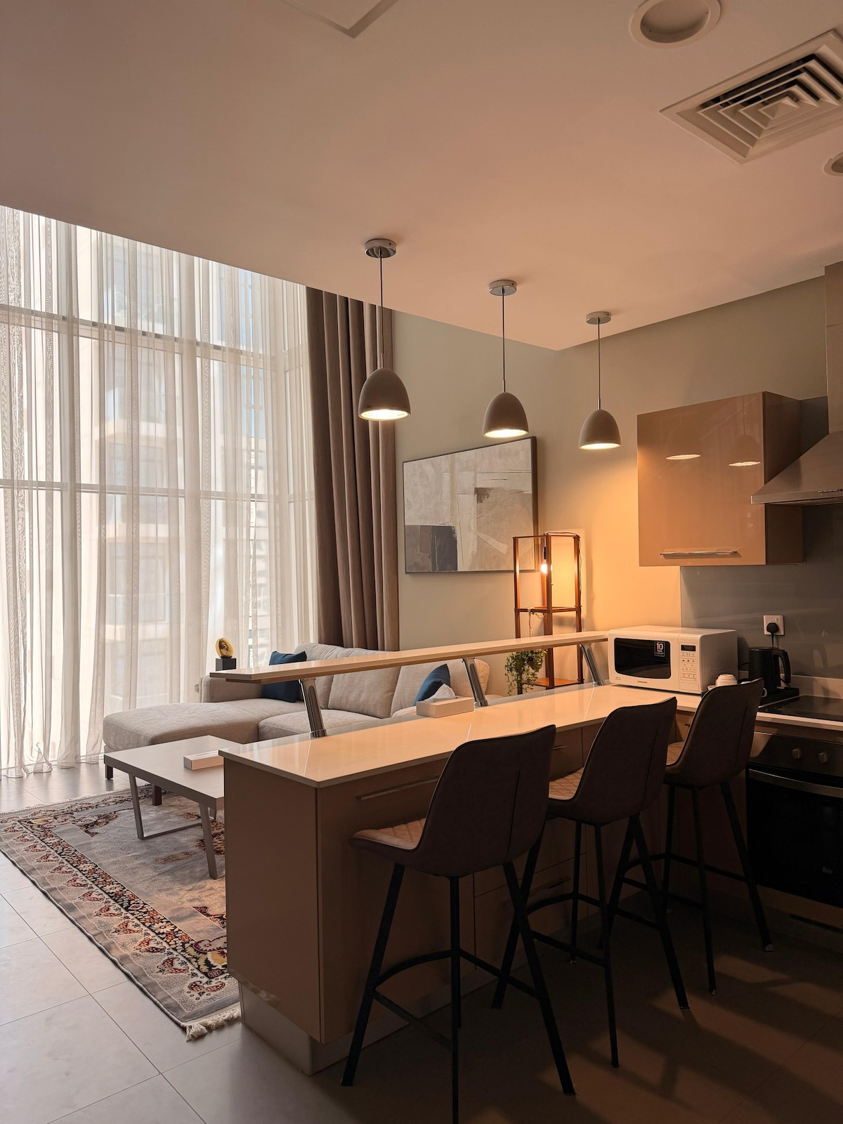 Descubre la escapada perfecta en este impresionante dormitorio amueblado en el piso 35 que cuenta con elegancia moderna, una cocina totalmente equipada y vistas impresionantes desde tus balcones privados. Disfruta de servicios como cine, gimnasios separados (hombres/mujeres), sauna, sala de vapor, piscina/jacuzzi compartidos, pista de jogging y zona de barbacoa. Aunque las tiendas y los restaurantes están a solo cinco minutos en coche, la zona es muy tranquila. Ofrecemos comodidad y estilo para una estancia inolvidable durante tu visita a Baréin.
