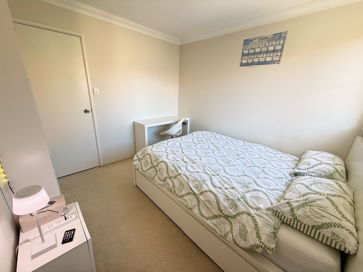 Private room in a bright, airy home in Victoria Park, set in a secure gated complex. It’s peaceful and cosy, with plenty of natural light and a shared bathroom (I rarely use it). You’ll have a clean, fully equipped kitchen (gas stove, microwave & air fryer), plus laundry (10kg washer). Enjoy the big backyard with an outdoor lounge, and a home gym (cardio + weights). It’s just me living here—quiet and respectful. Brand-new large fridge just for you. Shoes-off home. Close to the Swan River.