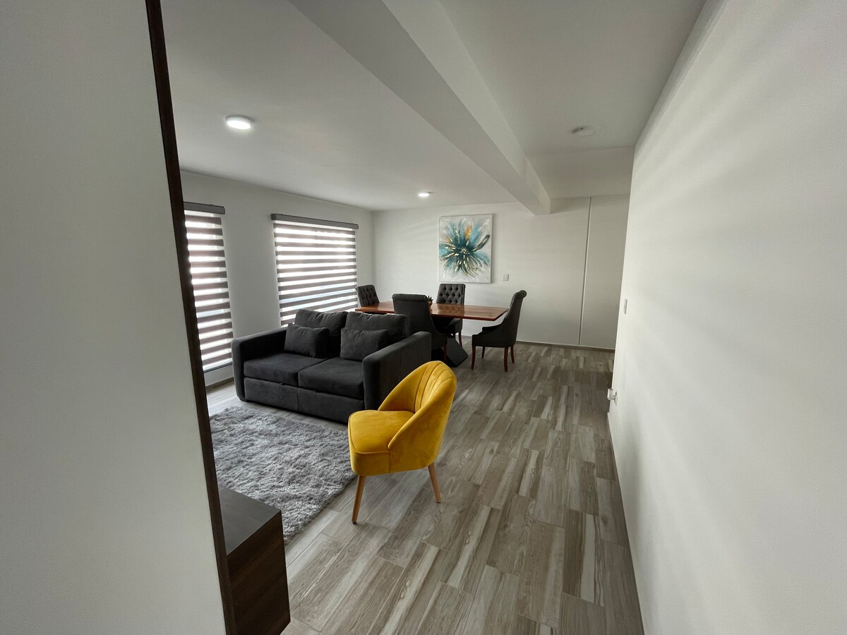Departamento nuevo con estacionamiento y todo lo necesario para una estancia muy placentera que hará que desees regresar. La ubicación es inmejorable ya que se encuentra a unos pasos del centro comercial Mundo E y de Chedraui para que puedan disfrutar de restaurantes, cines, pista de hielo y todas las amenidades a 3 minutos caminando del departamento, wifi de alta velocidad, pantalla "55" netflix, gimnasio, ludoteca, y salón de juegos. El oxxo más cercano a 5 mtos. Plaza Satélite está a 1.5 km.