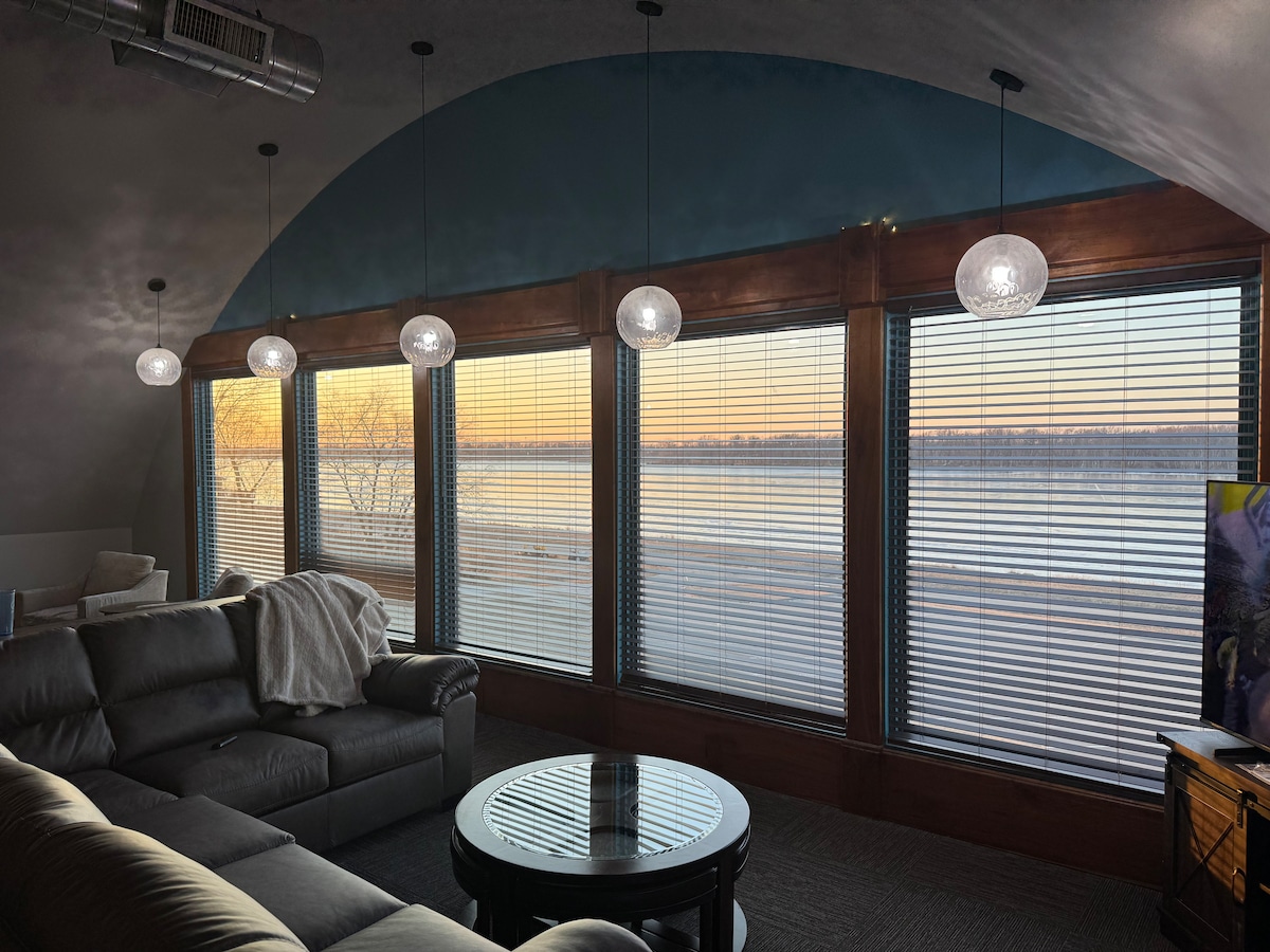 Step into our beautifully renovated historic gem, offering one of the most breathtaking views of the Mississippi River in Northern Illinois. Enjoy a retro 60+ arcade game, foosball, & shuffleboard to play with the family! Sit back and relax with a beautiful view of the Mississippi River! Perfectly positioned for exploration, we're only minutes away from Eagle Point Park, Lock & Dam 13, the iconic Fulton Windmill, Thomson Causeway, and the stunning 60-mile Great River Trail!