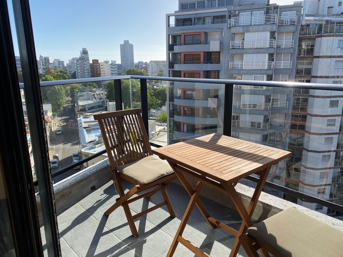 Luminoso, con amplia terraza orientada al NE, smart TV, WIFI. Hermosa vista de la ciudad. Amplios espacios interiores y exteriores de uso común: roof top con piscina, solarium, gimnasio, laundry, cine, 2 parrilleros, ámbito cuidado y refinado. Ubicación excepcional, 1.5km de Playa Ramírez y 1.5km de Playa de los Pocitos, a metros de Punta Carretas Shopping, a 4km de Terminal Tres Cruces. El uso del gimnasio y piscina son libres, los parrilleros se reservan con un costo mínimo para limpieza.