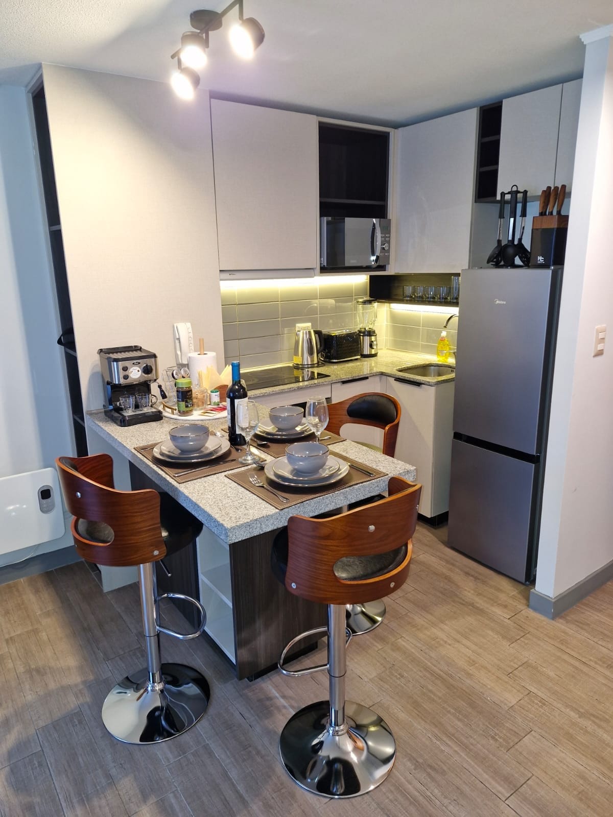 Disfruta una estadía cómoda y sin complicaciones en un departamento moderno, luminoso y totalmente equipado en un edificio seguro. Ideal para quienes vienen a conciertos, parejas, viajeros de estadías cortas y medias o para realizar teletrabajo. Situado en Av. España, a pasos de Movistar Arena, Parque O’Higgins, Fantasilandia, Barrio Universitario y Club Hípico. Con excelente conectividad a todo Santiago gracias a su cercanía con Metro Toesca (L2), Metro República (L1) y locomoción colectiva.