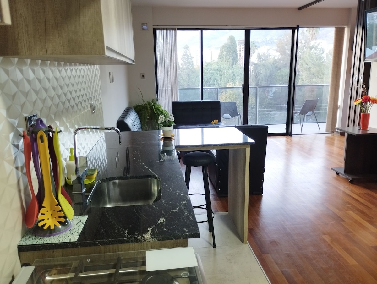 Disfruta en pareja o con toda la familia en este cómodo departamento, linda vista desde la terraza, ideal para viajes de turismo o trabajo, a pasos de la Recoleta, Cine Center, patio de comidas, principales parques, bares y restaurantes. Transporte público y parada de taxis en la puerta. Check in 12:00am y Check out 10:00am (flexible según disponibilidad) Puede reservar para máximo 4 personas. Horas de silencio desde las 10 pm. NO FIESTAS NI VISITAS. Cámaras de vigilancia y seguridad 24 hrs.