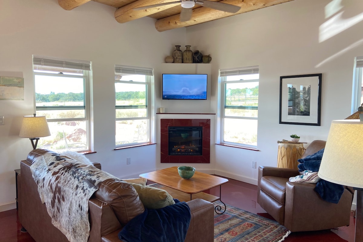 Ubicada en la base de una montaña majestuosa, Casa del Río ofrece vistas panorámicas de la mesa y el río, con el río Jemez que fluye a través de la propiedad. Las comodidades modernas se encuentran con la belleza natural: disfruta de las puestas de sol desde la terraza, de los s'mores junto a la fogata junto al río y déjate llevar por los relajantes sonidos del agua. A solo cinco minutos de aguas termales y caminatas panorámicas, y a solo una hora de Santa Fe o Albuquerque, es el lugar perfecto para relajarse, explorar y crear recuerdos inolvidables.
