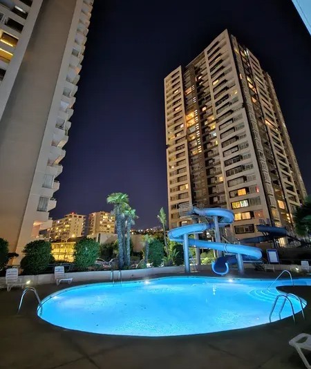 El departamento es moderno ubicado en un piso alto por lo cual tiene una espectacular vista. El transporte público esta a pasos de la calle principal 1 norte y camino troncal, centro de la ciudad, supermercados y Universidades. (U Federico Sta Maria & Sto Tomas). El barrio es tranquilo, ideal para parejas, con balcón y piscina privada. Depto sin calefacción. Distancias: ■ 15 - 20 minutos caminando aprox. de super JUMBO. ■ 15 min de la playa y casino en vehiculo. ■ Estacionamiento techado.