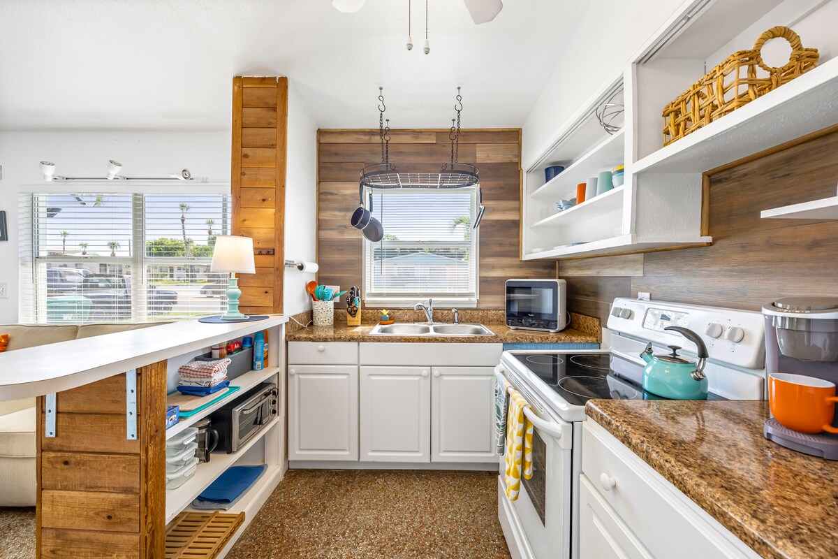 Disfruta de Cocoa Beach y de la arena entre los dedos de los pies en este estudio privado de Coastal Haven con cocina totalmente equipada, baño con ducha y todas las comodidades. Se proporciona toda la ropa de cama, TV de 50 pulgadas con cable de transmisión y wifi, purificador de aire HEPA, toallas de playa, sillas, sombrilla y carro de playa también. Vallado en una zona de patio con jardín privado con mesa de comedor y sillas, lavadora y secadora disponibles, apto para perros, aparcamiento en la calle, llegada autónoma con teclado y a solo unos pasos de la playa.