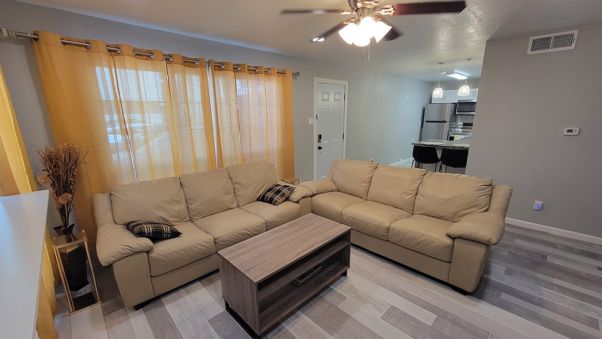 Un lindo condominio de 2 dormitorios con capacidad para 4-6 personas está disponible mes a mes para enfermeras de viaje, profesionales corporativos y familias que se mudan. Estación de trabajo remoto con monitor y comodidades para bebés disponibles. Ubicado cerca de EPIC, HW75, GB Turnpike y centros corporativos y hospitalarios, nuestro condominio de 1150 pies cuadrados ofrece dos dormitorios en la planta alta que comparten un baño completo y una planta baja con una sala de estar, medio baño y una cocina totalmente equipada con lavadora y secadora. A poca distancia a pie de café, restaurantes y un supermercado.