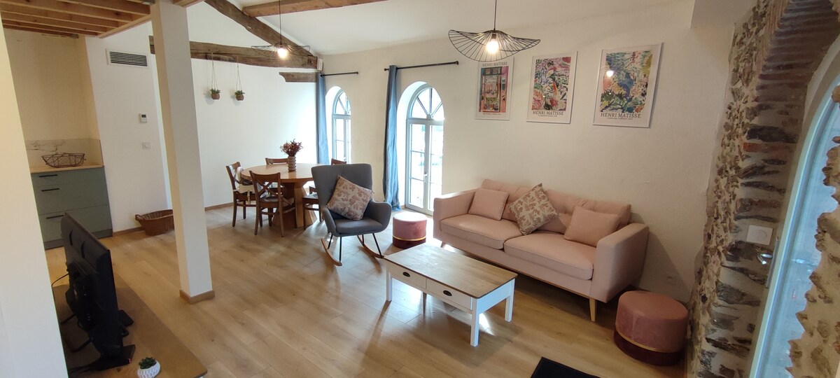 Superbe T3, neuf dans une ancienne bâtisse à l'entrée du village de Collioure, à seulement 2min à pied du centre et des plages .Cet ancien bâtiment industriel âgé de plus de 200ans, tombait en ruine avant d'être entièrement rénové. Le charme de l'ancien, le caractère de la pierre mêlés à tout le confort moderne pour accueillir jusqu'à 5 voyageurs.En plus d'un grand séjour-cuisine, de 2 chambres et d'un couchage d'appoint en mezzanine, il dispose d'une grande terrasse,d'un parking et de la clim.