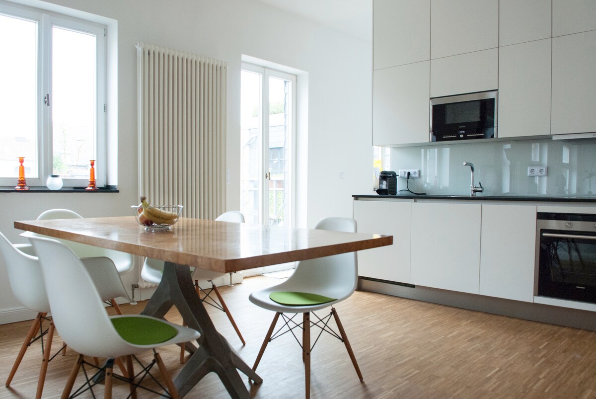 Loft luminoso y acogedor (80 metros cuadrados) para máx. 4 personas. Cocina de planta abierta, baño, vestidor separado, increíble, gran terraza en la azotea. Se admiten mascotas y se cobrarán 20,--€ por estancia. Excelente ubicación céntrica en el centro de Düsseldorf-Oberkassel, pero muy tranquilo. ¡Tranvía, supermercado, panadería y muchos restaurantes están a poca distancia a pie, a 2-5 minutos! ¡Estacionamiento de un sitio en el patio interno de forma gratuita!