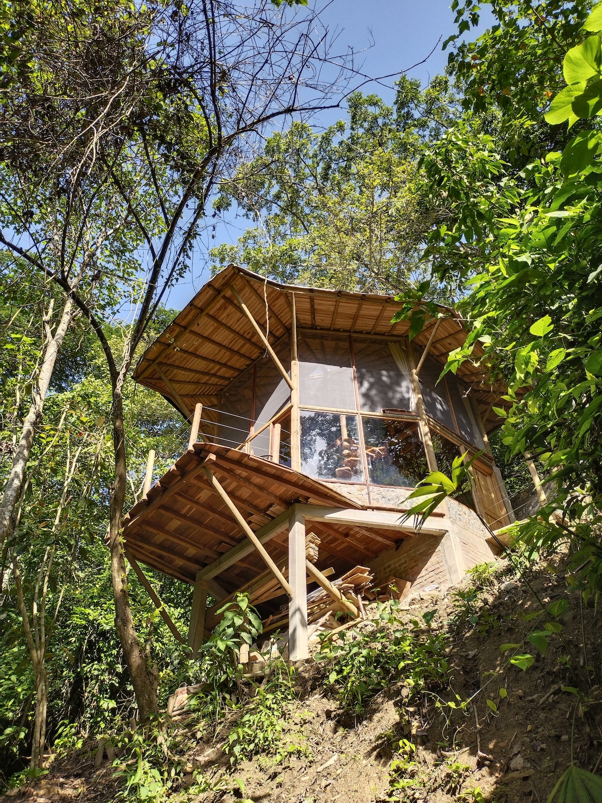 La Estrella is a beautiful wooden jungle house floating in the sky between the treetops - a place for you to deeply relax and reconnect with nature. Located very close to Minca, it is surrounded by mountains, colorful birds and butterflies of the Sierra Nevada de Santa Marta. Awakened by the sunrise you can have a refreshing dive in the river closeby which is part of the property. The chalet will be entirely for your private use. Please feel welcome to enjoy this piece of paradise!