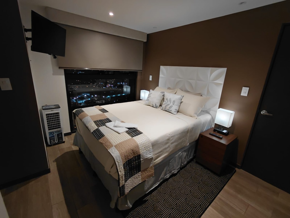 Relájate en nuestro acogedor y exclusivo apartamento con vistas a los volcanes. Este espacio en esquina combina calidez, confort y privacidad, perfecto para un viaje de trabajo, una escapada romántica o simplemente descansar. Sumérgete en el confort de una cama Sealy Premium y disfruta de amplias áreas equipadas, junto con un moderno espacio de trabajo. Piscina climatizada, gimnasio, rooftop y seguridad 24/7. A solo minutos de centros comerciales, museos, mercados y el aeropuerto.