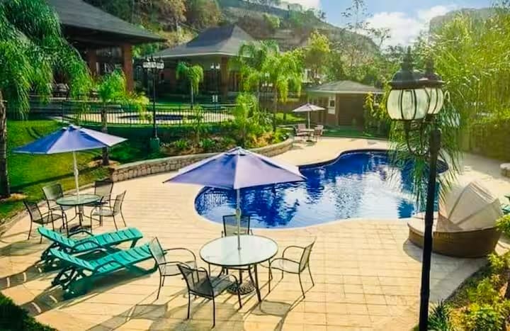 Escápate del ajetreo de la ciudad; aquí encontrarás un espacio tranquilo y fresco, perfecto para relajarte. Contamos un amplia zona de estar, piscina, área para fogata, y asador con todos sus accesorios. Ven y disfruta de un merecido descanso 3 camas queen 2 hamacas. Horas de silencio a partir de las 11 pm Salida a las 11 am El ingreso de personas no reportadas generarán un costo extra. El salir después de la hora límite generará un costo extra. No se permiten mascotas.