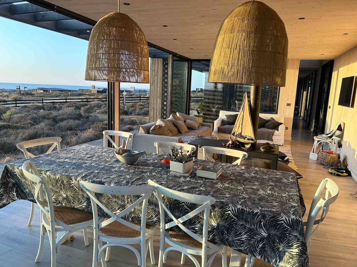 Casa moderna y amplia con vista al mar, piscina y quincho, ideal para hasta 10 personas. A 15 minutos caminando de la playa, en condominio con entrada controlada, senderos y canchas. Cuenta con 3 habitaciones con terraza y vista al mar, hasta 7 camas y un sofá cama. WiFi Starlink, Smart TV, cocina equipada y calefacción. Gran espacio de estacionamiento. Se permiten mascotas, pero el cercado no es totalmente cerrado. Zona tranquila y privada, perfecta para relajarse y disfrutar. Te esperamos!