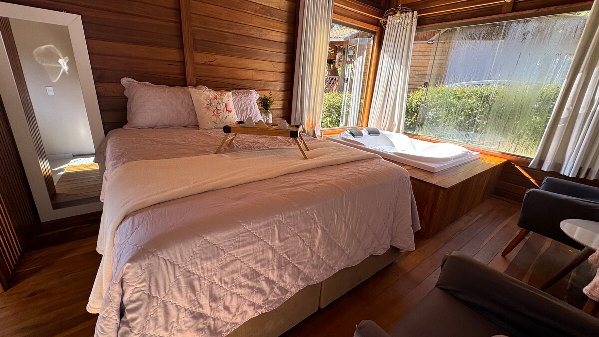 Cabana é um refúgio encantador, cercado pela beleza natural. Construída com material naturais, madeira, tijolinho rústico oferecendo uma experiência de hospedagem única. Oferecemos ao casal romântico que curtem um lugar privativo com piscina banheira de hidromassagem lareira com tv smart 43´cozinha toda equipada área de churrasco com rede e poltronas de alto padrão, fornecemos roupas de cama e banho sabonetes e sais de banho. E para quem gosta de uma aventura um passeio de trilha na mata.