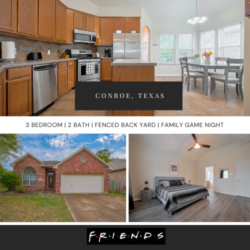 Relájate y desconecta en esta casa de nueva construcción, moderna y elegante. Situado en el corazón del centro de Conroe. Muy cerca de excelentes restaurantes, entretenimiento y el centro de convenciones de Conroe. A unos 15 minutos del lago Conroe, ¡estas vacaciones serán inolvidables! Disfruta de una película en la azotea bajo las estrellas o crea recuerdos alrededor de la chimenea al aire libre en el patio trasero. Ponte cómodo frente al televisor de 75 pulgadas. Con televisores en todas las habitaciones, disfruta de una noche de descanso tranquila en cómodas camas.