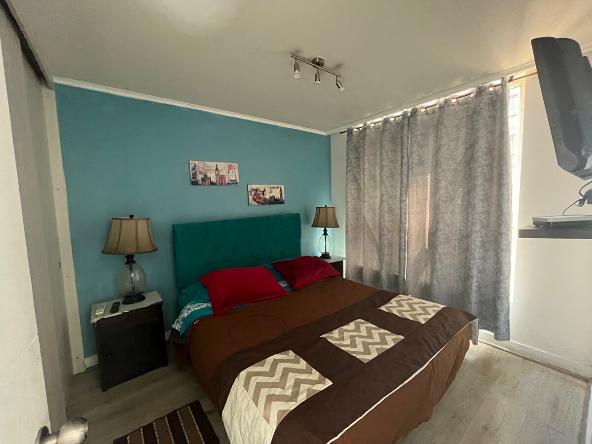 Luminoso departamento, bien equipado con piso flotante en living y dormitorio. El dormitorio tiene cama Box Spring de 2 plazas, impecables sabanas, tiene un Smart Tv led cuenta con Netflix , internet via wifi. La cocina cuenta con refrigerador, horno eléctrico, microondas, tostador, ollas y utensilios de cocina para cocinar. Tiene loza y cuchillería completa. Si esta mas de 6 noches dejo sabanas de recambio. El balcón cuenta con una terraza con mesa y 2 sillas.