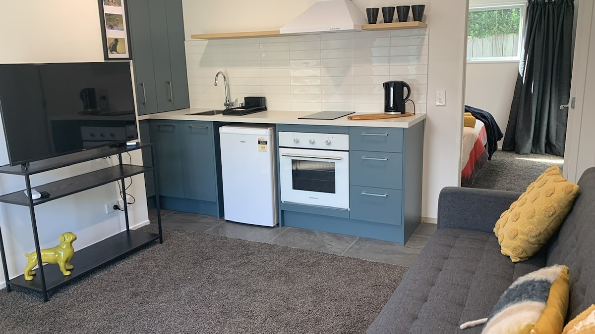 Te damos la bienvenida a nuestro estudio, soleado y cálido. Un nuevo espacio compacto en la planta baja de nuestra casa que es funcional y cómodo. Cuenta con una sala de estar de planta abierta, cocina pequeña y cama con baño privado. Hay nevera, microondas, cocina de inducción portátil de una sola placa, fregadero, tostadora, jarra, lavadora y TV. El aire acondicionado proporciona calidez en invierno y un agradable espacio fresco para el verano. Ideal para una persona o pareja que busque alojamiento entre las tranquilas colinas de Arrowtown.