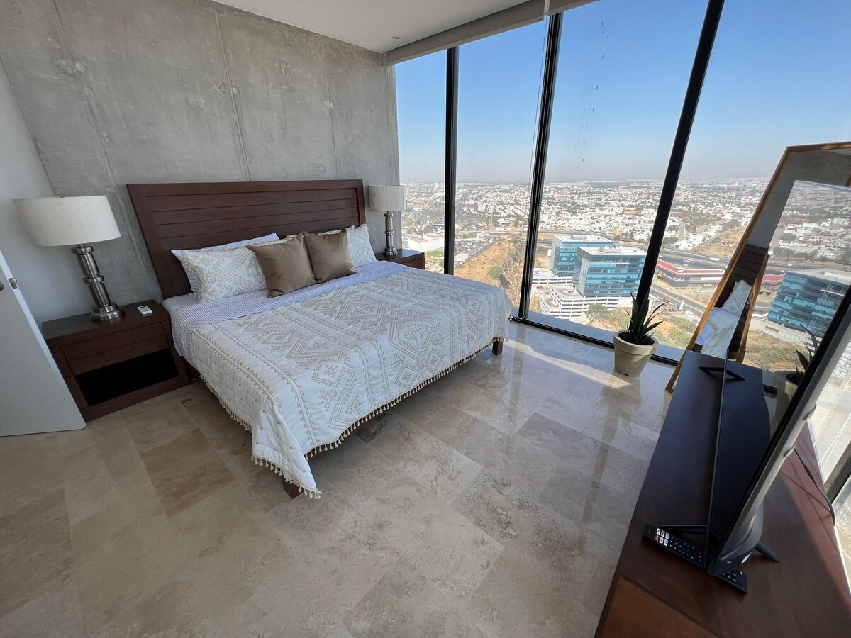 Es un espacio ideal para ejecutivos, estudiantes, estadía vacacional o para pasar una noche romántica! Con una vista espectacular a la Ciudad de Querétaro, Centro Sur y Centro de Convenciones Rodeado de mucha naturaleza y al mismo tiempo del movimiento que energiza la ciudad En una de las mejores zonas de Querétaro, dónde encuentras servicios premium de primera necesidad a unos pasos como Fresko, Starbucks, Walmart Expréss, Oxxo Premium, Tiendas veganas, Gimnasios, Restaurantes y Cafeterias