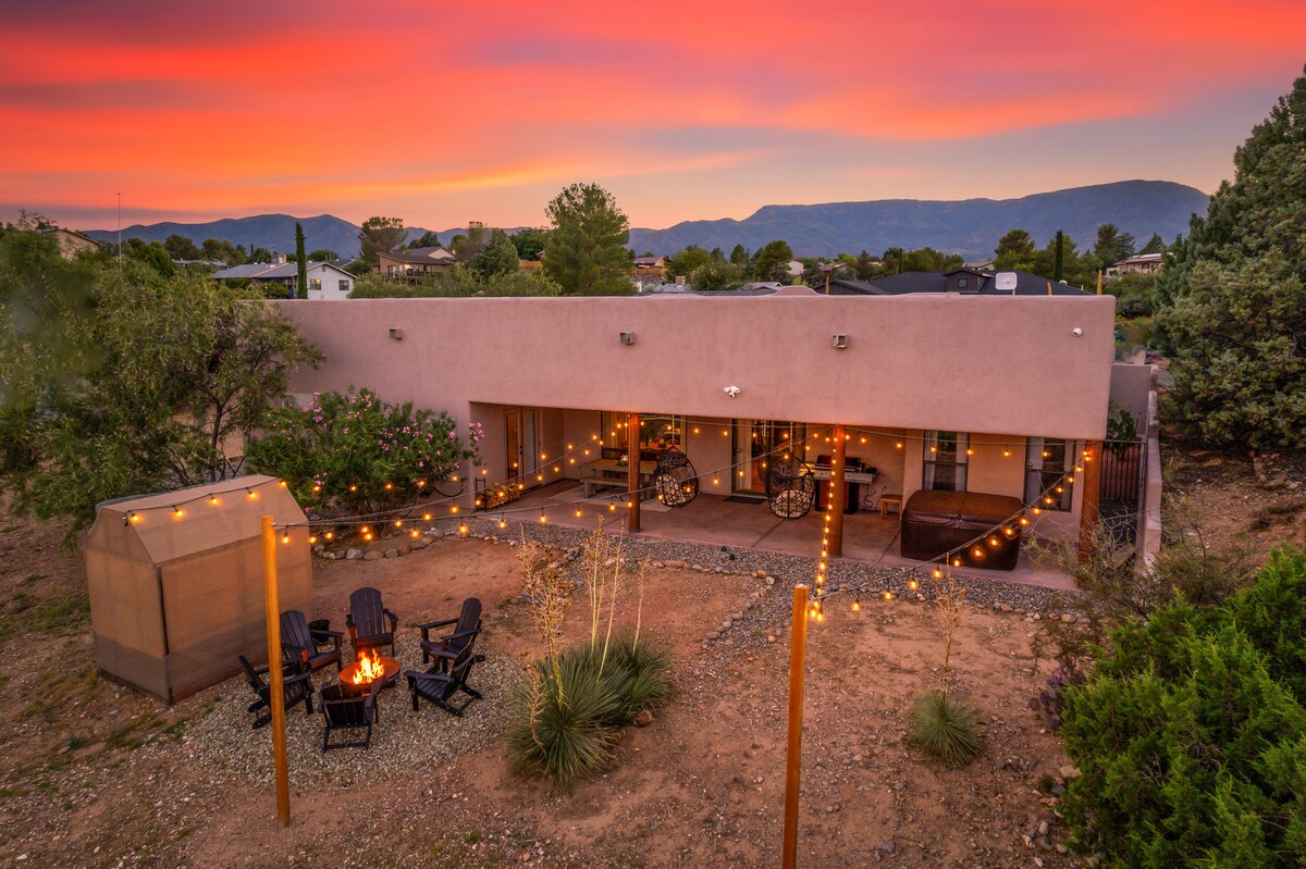 ¡Te damos la bienvenida al Cottonwood Resort! 🌟 Impresionantes vistas a la montaña: sumérgete en las impresionantes vistas de Sedona Red Rock desde tu sala de estar. Ambiente 🏡 acogedor: relájate con chimeneas interiores y exteriores después de un día de aventuras. 🎬 Entretenimiento listo: relájate con un Amazon Fire TV de 65 pulgadas para transmitir tus favoritos. Retiros 🛏 cómodos: amplias habitaciones que garantizan noches de descanso. Ubicación 🚶♂️ privilegiada: a minutos de Sedona, Jerome, el casco antiguo, bodegas y el rancho Blazin 'M.