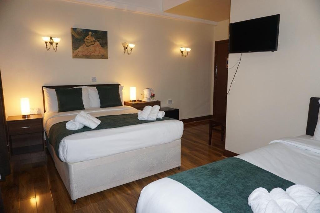 This is a family room containing a single and a double bed, perfect choice for a family of three. All the rooms at the property are equipped with private bathrooms, toiletaries, hairdryer, coffee and tee making amenities, mini fridge and cable television.