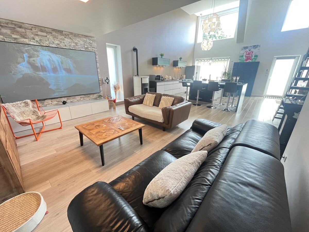 🚩 Bienvenue au Loft ! 🎁 Une bouteille de champagne offerte en cadeau de bienvenue 🥂🍾 🏠↔️Très spacieux, Loft de 150 m2 💤 Calme et confortable 🤴 Lit King Size 👸 Lit Queen Size 🛋️ Canapé convertible 🧖♀️🫧 Baignoire balnéo dans la salle de bain pour vous détendre 📽️🛋️ Vidéoprojecteur 4K dans le salon, comme au cinéma 🅿️🚘 Parking gratuit, privé et sécurisé sur place. Largeur : 2m25. Longeur 4m90. Hauteur : 2m00 🎅 Le marché de Noël en décembre est à 15 minutes à pied