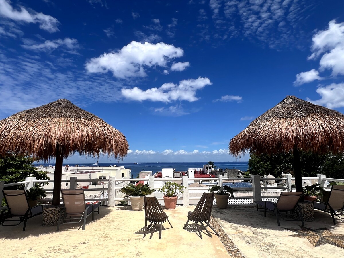 A unos pasos del mar, caminando 100 metros podrás ver cardúmenes de colores paseando por la costa.Esta habitación cuenta con vista parcial al mar desde el balcón. Puedes encontrar tiendas, restaurantes, bancos, farmacias y cualquier tipo de servicio a solo unos pasos. Estación del Ferry a tres calles. Espacio lleno de tranquilidad, podrás descansar y renovar energías. Contamos con alberca en nuestro patio y podemos acercarte a muchos servicios recreativos como de snorkeling y buceo.