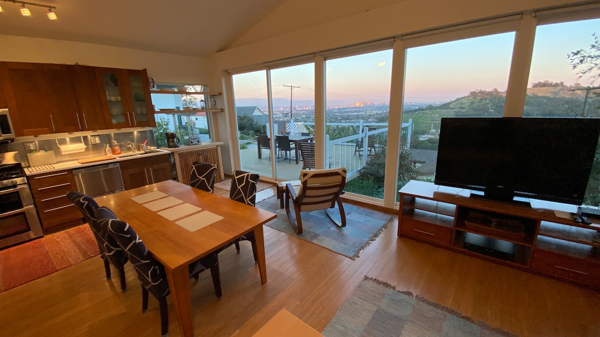 Moderna casa de mediados de siglo con 2 dormitorios/2 baños con vistas espectaculares sobre Sunset Strip (a 2 manzanas de Hollywood + Fairfax). A solo unas manzanas de la acción, pero muy privado y tranquilo. Renovaciones recientes desde el techo hasta los cimientos, sistema de calefacción/aire acondicionado, wifi de 1 Giga/seg, cableado de entrada y salida con 11 altavoces, proyector de cine + dos televisores 4k (Netflix gratuito, HBOMax y AppleTV+), estacionamiento para 2 coches con cargador eléctrico de nivel 2. Nota: No se permiten reuniones sociales ni noches ruidosas hasta tarde. Interior = 1015 pies cuadrados. Cubierta = 300 pies cuadrados.