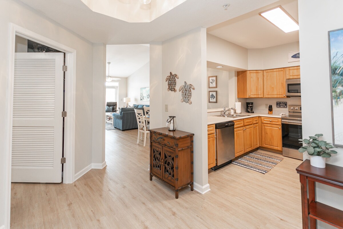 Apartamento de 1 dormitorio recién remodelado con cama tamaño king, sofá cama tamaño queen, televisores de 55 pulgadas en la sala de estar y el dormitorio. Escaleras a la unidad del tercer piso con patio privado. Cocina totalmente equipada, lavavajillas, lavadora/secadora, wifi, TV por cable, casa club, gimnasio, canchas de tenis, 2 piscinas (1 climatizada), canchas de tejo, zona de picnic con parrillas y pasarela privada a la playa. Se admiten perros (SOLO 1 PERRO) con una tarifa de mascotas de 100 USD que se debe pagar en el momento del registro. Debe ser capaz de subir escaleras. Apartamento en un tercer piso.
