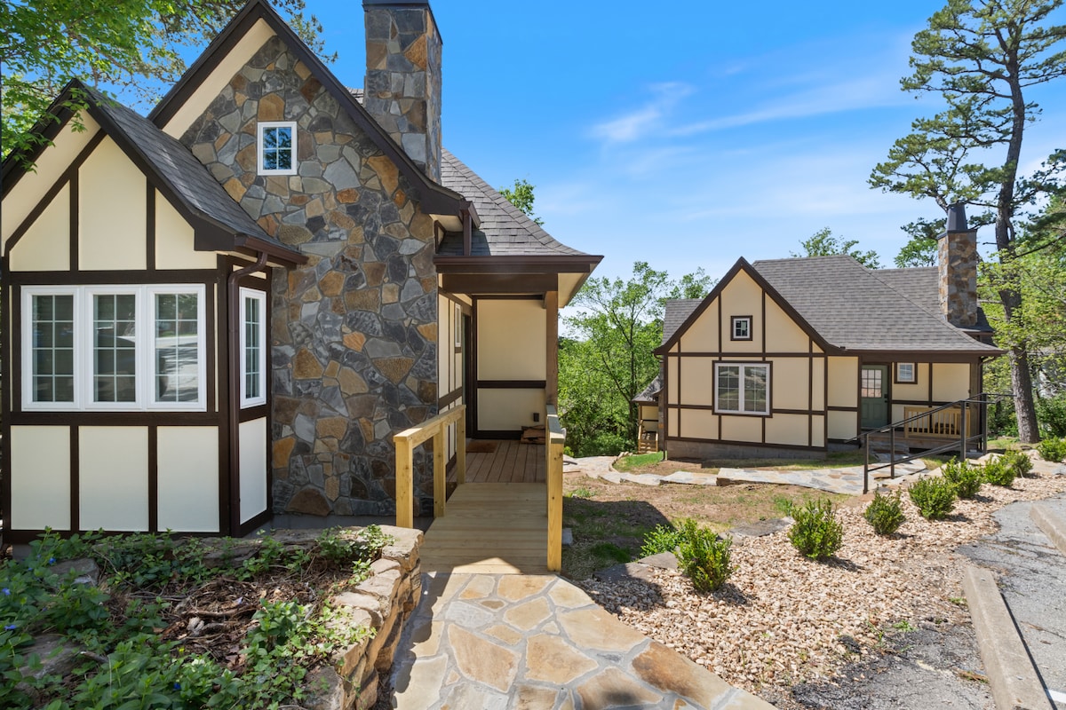 La casa principal tiene 4 dormitorios, 3 baños con 3 duchas, 2 pisos, 2 dormitorios en cada piso, con mucho espacio abierto. Hay una terraza trasera con un porche cerrado con vistas a las montañas Ozark y una chimenea de gas en la sala de estar. Estamos ubicados justo después del hotel Cresent en una calle sin salida con estacionamiento en la entrada y frente a la casa. A poca distancia a pie del centro de la ciudad. Hay una casa de campo de Airbnb separada en la misma propiedad llamada Carriage House si necesitas espacio adicional.