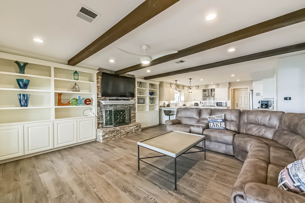Relajante casa frente al mar con las mejores puestas de sol en el lago Houston. Casa rústica moderna y actualizada con sala de estar abierta y terraza de gran tamaño, perfecta para pasar tiempo de calidad con familiares o amigos. Cocina totalmente surtida con electrodomésticos de acero inoxidable, máquina de hielo, enfriador de bebidas, nevera para vinos y isla de cocina de gran tamaño. Pesca o nada en el largo muelle con escaleras al agua y enjuágate en la ducha al aire libre. Televisores inteligentes en todos los dormitorios y sala de estar con altavoces de sonido envolvente en espacios interiores y exteriores.