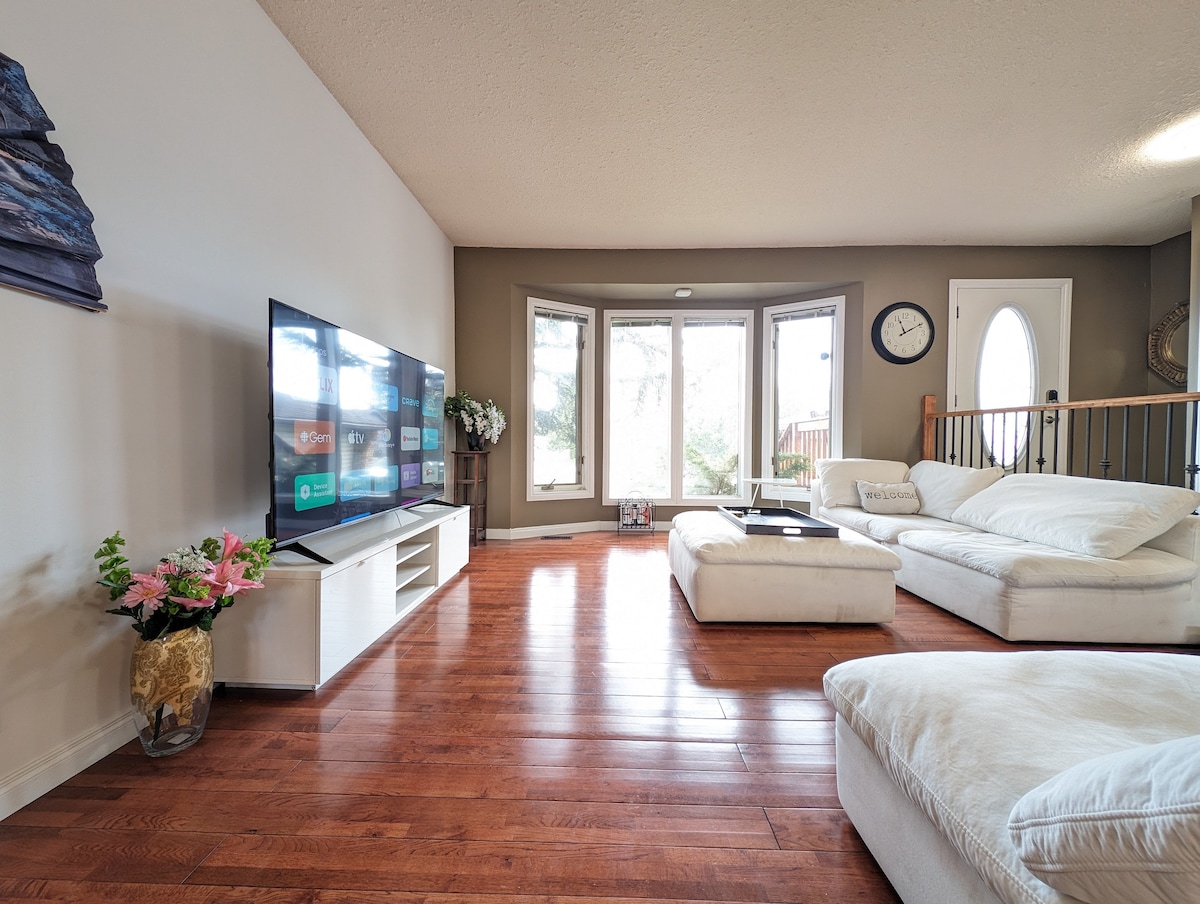 Relájate y desconecta en esta casa tranquila, elegante, recién renovada, limpia y luminosa. Esta unidad no es una suite en el sótano como otros alojamientos de precios comparables. Muy cerca de las tiendas con fácil acceso al centro de la ciudad. La autopista 2 está a solo 3 minutos. Aparcamiento reservado fuera de la calle. Televisores inteligentes con wifi junto con tu kurig personal para bebidas calientes. Cada dormitorio tiene su propia estación de carga de teléfono inalámbrico. A 14 minutos del aeropuerto internacional de Calgary.