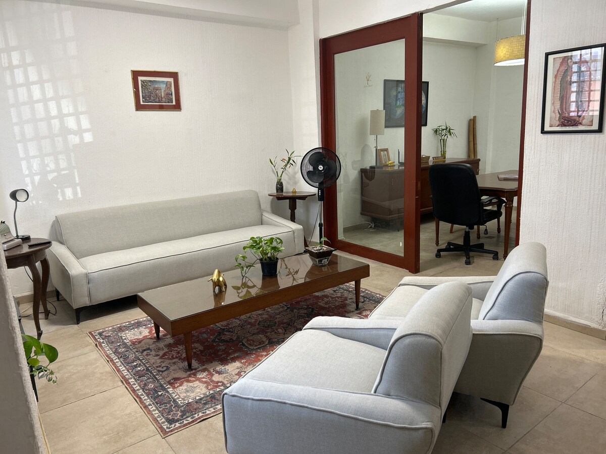 One bedroom apartment within a superbly converted colonial style Mexican house from the 1940s next to the 5 stars Camino Real Hotel, well located between Chapultepec Park/ Polanco, Roma & Condesa. King Size bed, one bathroom and spacious living room / open plan Kitchen. Main WiFi plus an Emergency Back Up Wifi Free Breakfast at my Cafe around the corner (Except Sundays and Bank Holidays. Cafe closed!) . Free weekly cleaning from 2 weeks or longer stays. Free use of Washing & Drying Machines.