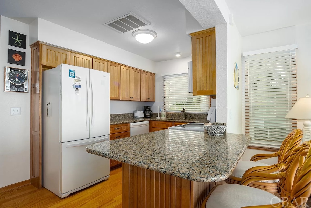 Preciosa casa adosada renovada y tranquila frente al mar con vistas increíbles en Duck NC, bancos exteriores. Disfruta de lo mejor de todo: puestas de sol tranquilas, piscina frente al mar, tenis, pickleball y deportes acuáticos justo a la puerta de tu casa. Preciosa playa justo al otro lado de la calle (a pie o con aparcamiento gratuito y fácil). Camina, ve en bicicleta, kayak o conduce hasta las tiendas de Duck, el paseo marítimo y los restaurantes (a menos de 2 km). Increíble ubicación con acceso a todo. Hermosas vistas, camas vibratorias ajustables con colchones de lujo y juguetes de playa y sonido.
