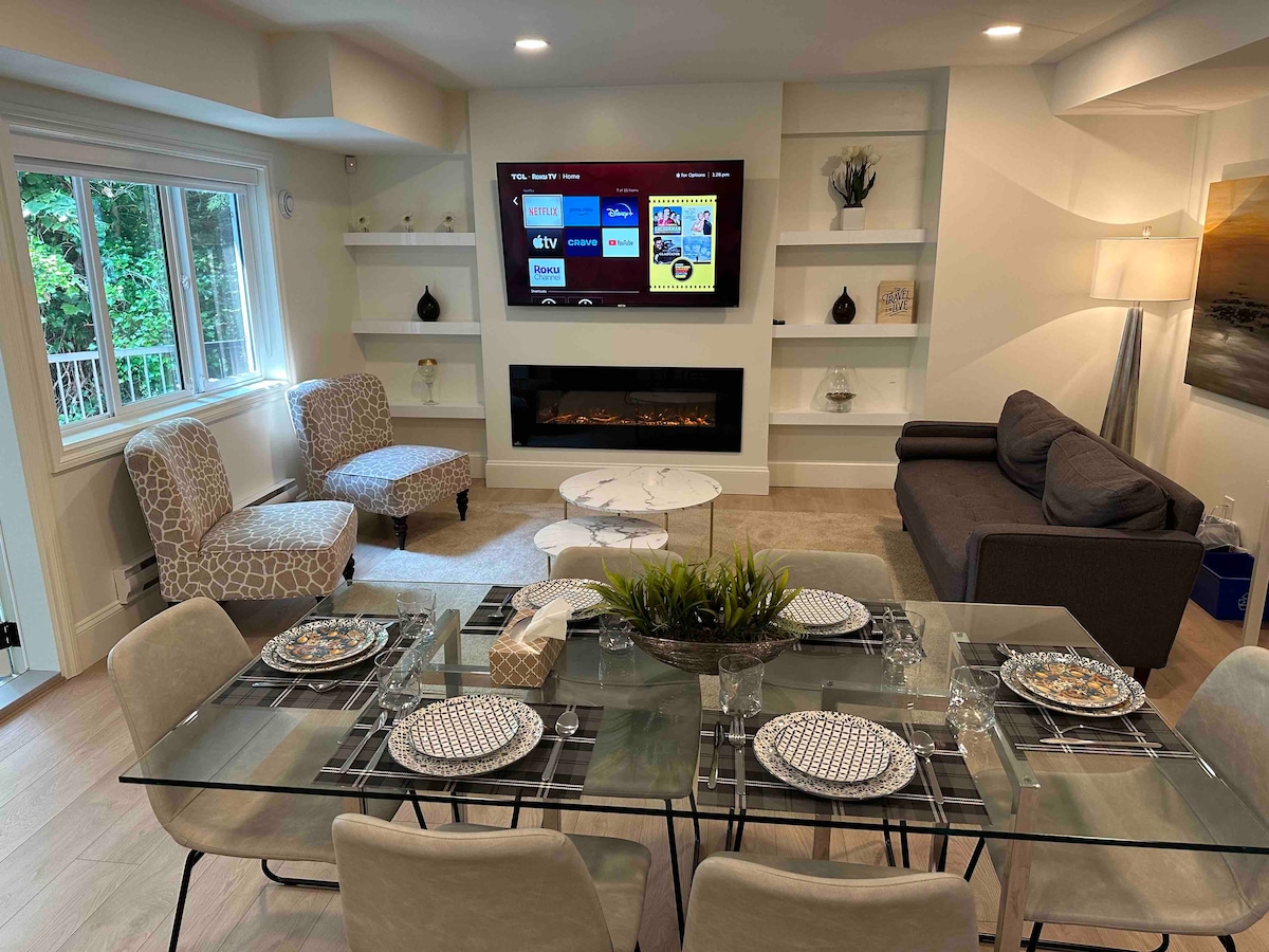 Privacy & style define this chic, modern & spacious sunlit space. Enjoy morning coffee from a private covered deck with forest views & soothing creek sounds. Fully equipped for convenience with air fryer, dishwasher, washer/dryer & 65 inch smart TV. Amazingly you’re only 10 mins to downtown, 5 mins to the mall, 5 mins to Ambleside beach, 10 mins to Cypress or Grouse Ski Hills, next to world class hiking and biking trails, & just 90 mins to Whistler! Book now for a most memorable Vancouver trip!